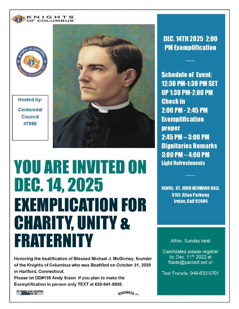 Exemplification Dec 14 By adminDecember 5, 2025December 5, 2025Knights of Columbus Share this: Click to share on X (Opens in new window) X Click to share on Facebook (Opens in new window) Facebook Click to email a link to a friend (Opens in new window) Email Like this:Like Loading... Related