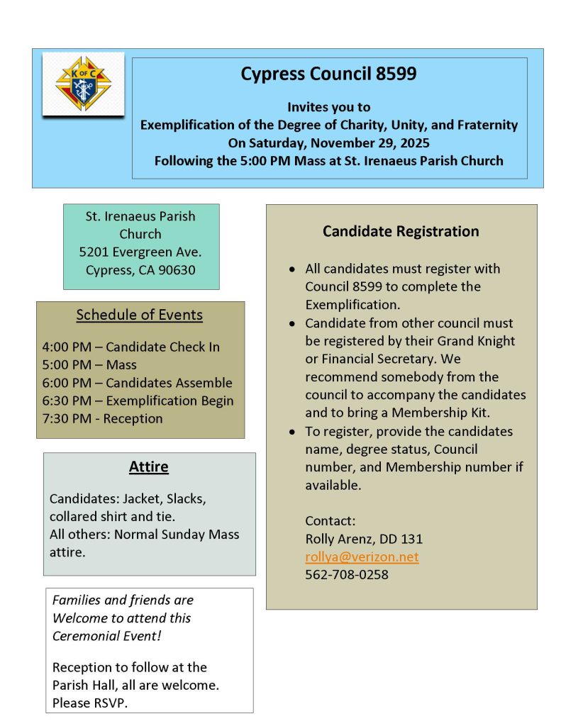 Exemplification Nov 29 By adminNovember 19, 2025November 19, 2025Knights of Columbus Exemplification Nov 29 Share this: Click to share on X (Opens in new window) X Click to share on Facebook (Opens in new window) Facebook Click to email a link to a friend (Opens in new window) Email Like this:Like Loading... Related